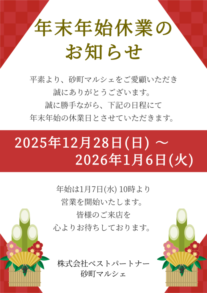 いつも砂町マルシェをご利用いただきありがとうございます😊年末年始の営業についてお知らせいたします。